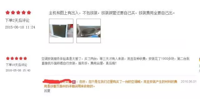 同時,消費者對于網購家用中央空調的反饋意見也比家用空調多,雖然大部分網友表示滿意,但細看留言也不乏質疑之聲。例如,有消費者反映到貨產品有瑕疵,或安裝工人態度不好,更多的則是對安裝收費額度的驚愕,比消費者預想的要高。除了抱怨,我們也能從留言看出網購家用中央空調安裝上的諸多現狀,很多消費者都感嘆家用中央空調的安裝比自己想象中復雜。